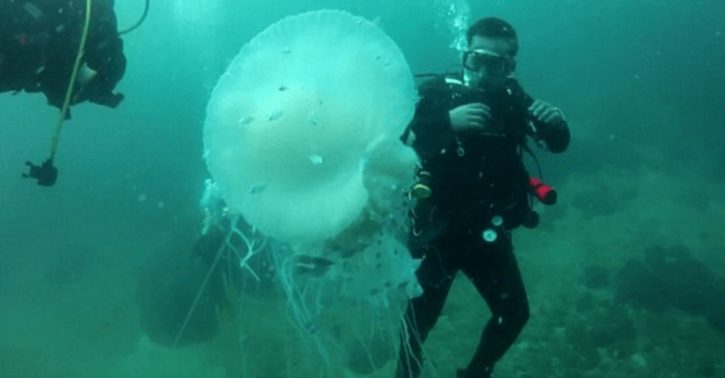 Momento increíble en el que un buzo se encuentra con una medusa gigante mientras que el buceaba en México
